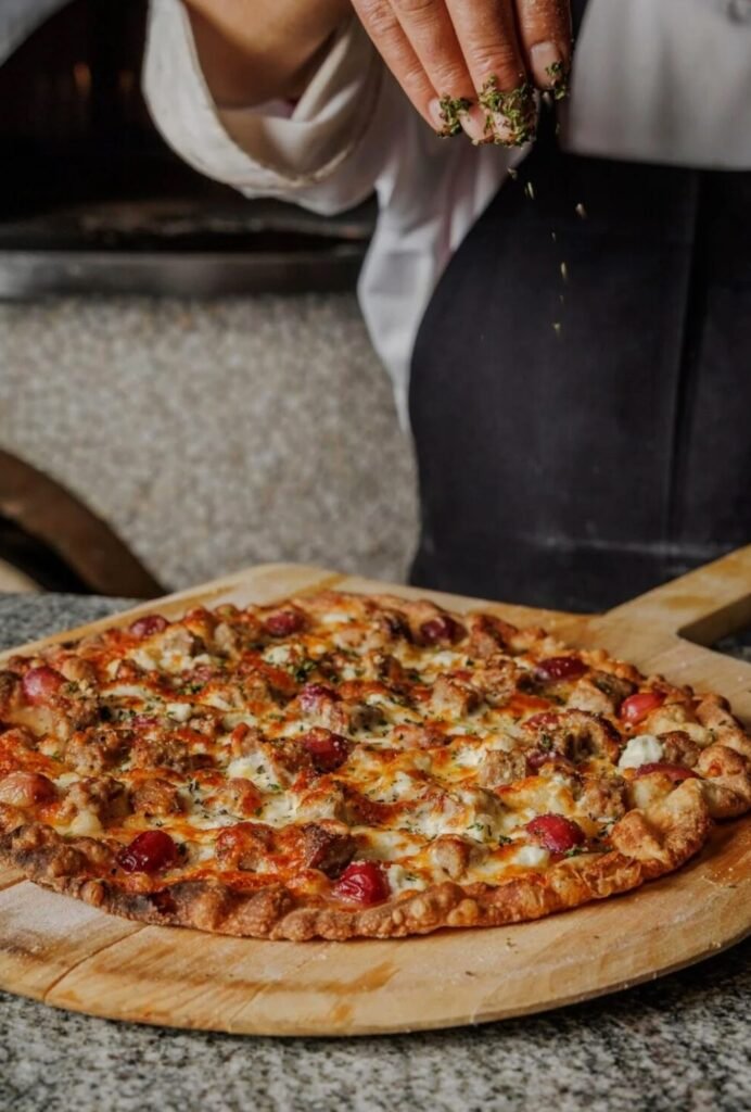 Indulge in your beloved traditional Margherita pizza, featuring classic toppings and a perfectly baked crust, or explore our unique signature pizza, the delicious sausage, grapes and goat cheese creation.